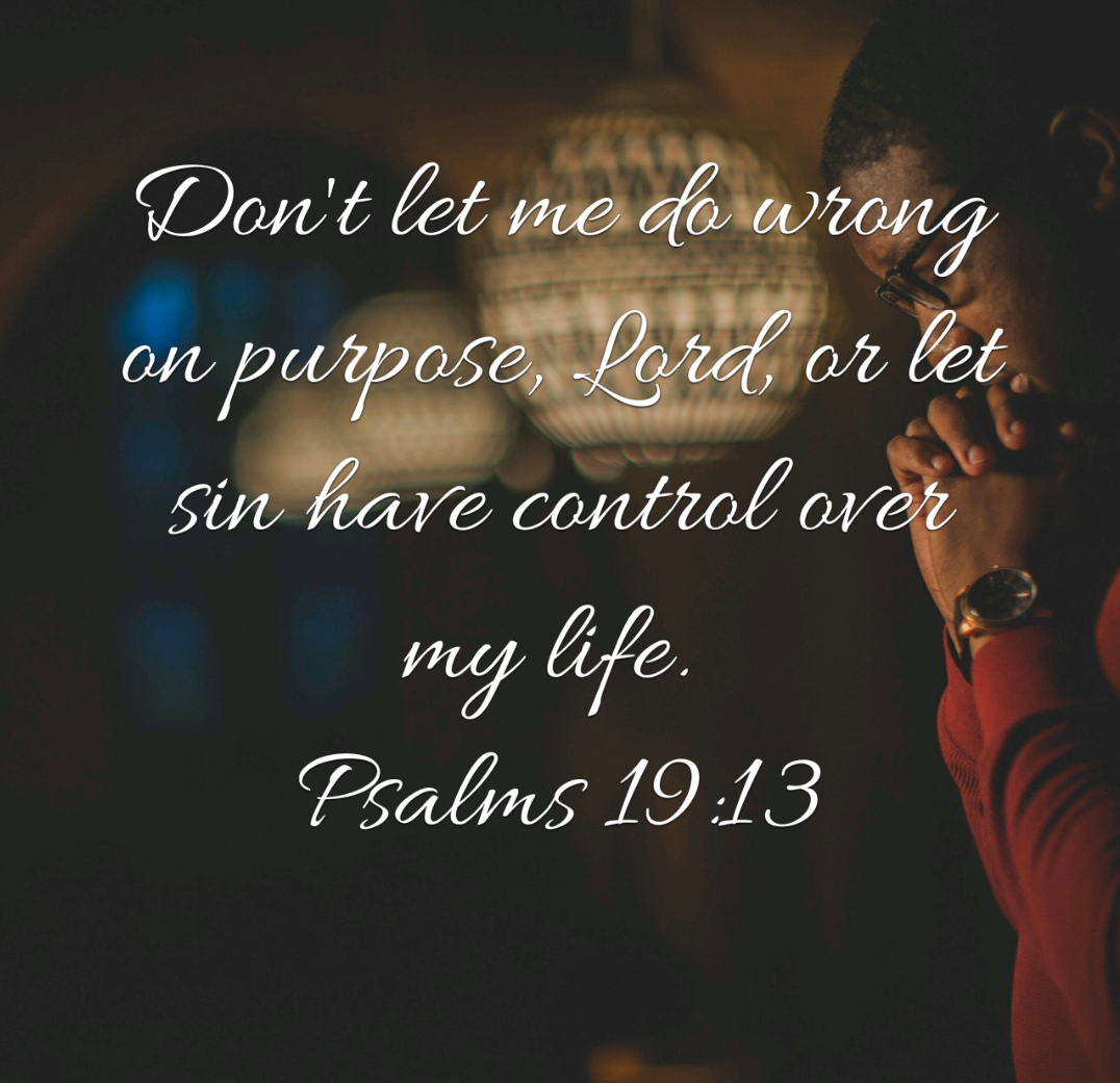 “Keep your servant from deliberate sins! Don’t let them control me. Then I will be free of guilt and innocent of great sin. May the words of my mouth and the meditation of my heart be pleasing to you, O lord , my rock and my redeemer”. (Psalms 19:13-14 NLT)