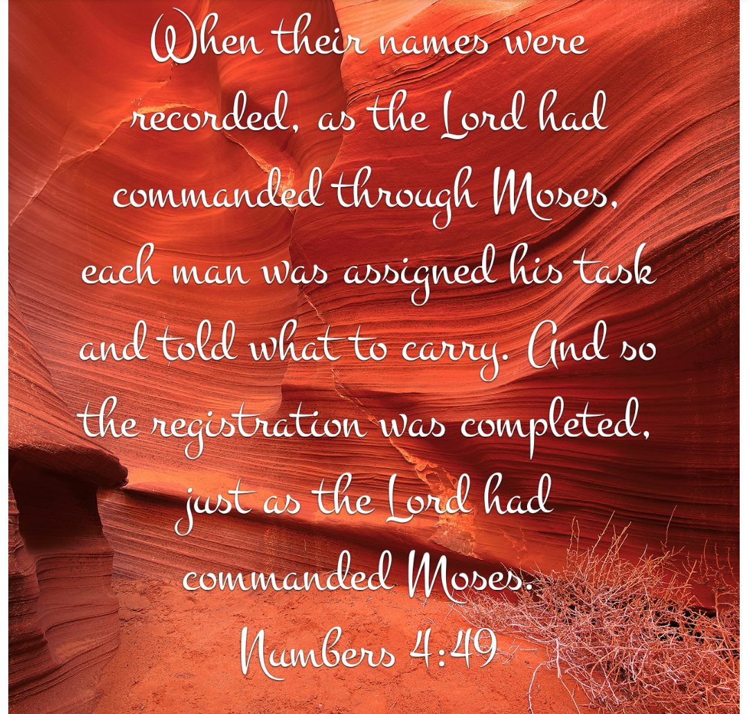 “When their names were recorded, as the Lord had commanded through Moses, each man was assigned his task and told what to carry”. Numbers 4:49 NLT