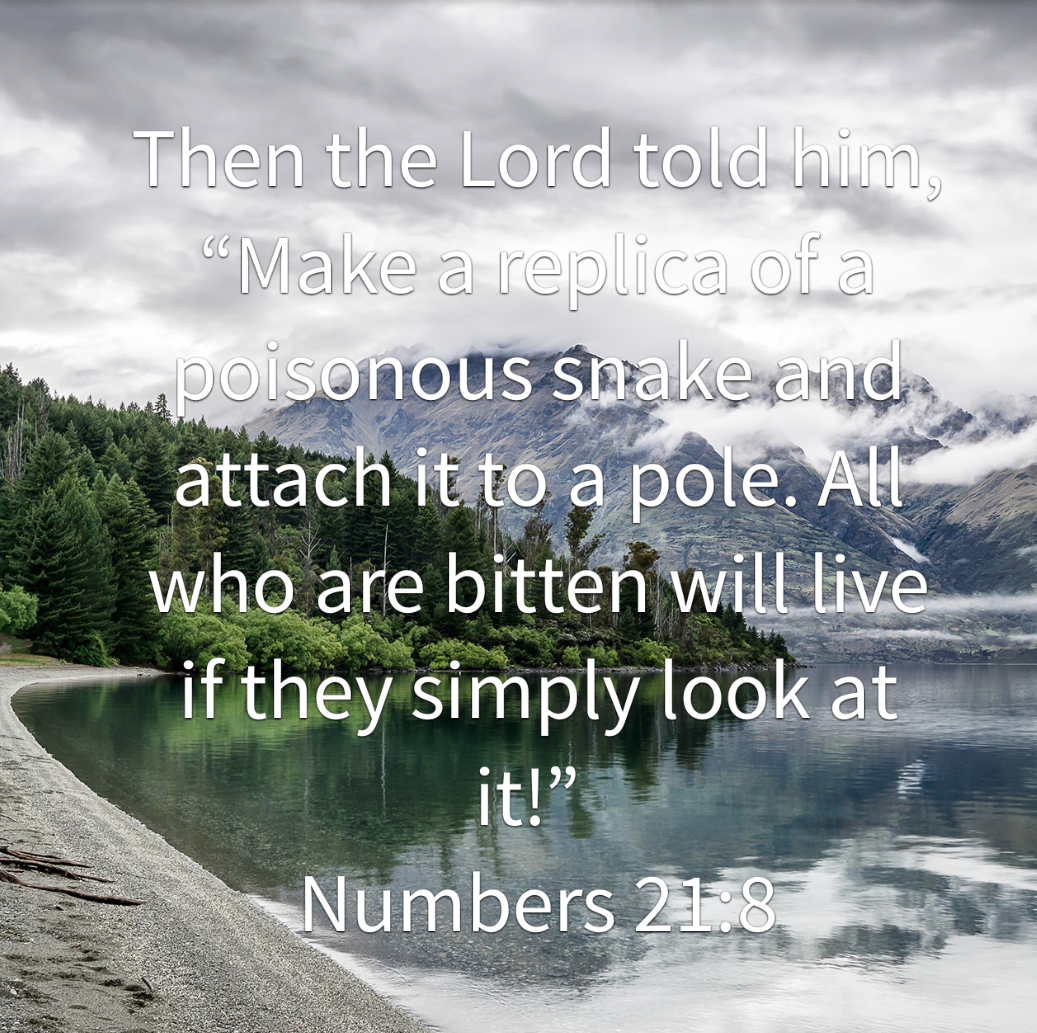 “Then the Lord told him, “Make a replica of a poisonous snake and attach it to a pole. All who are bitten will live if they simply look at it!” So Moses made a snake out of bronze and attached it to a pole. Then anyone who was bitten by a snake could look at the bronze snake and be healed” (Num 21: 8-9 NLT)