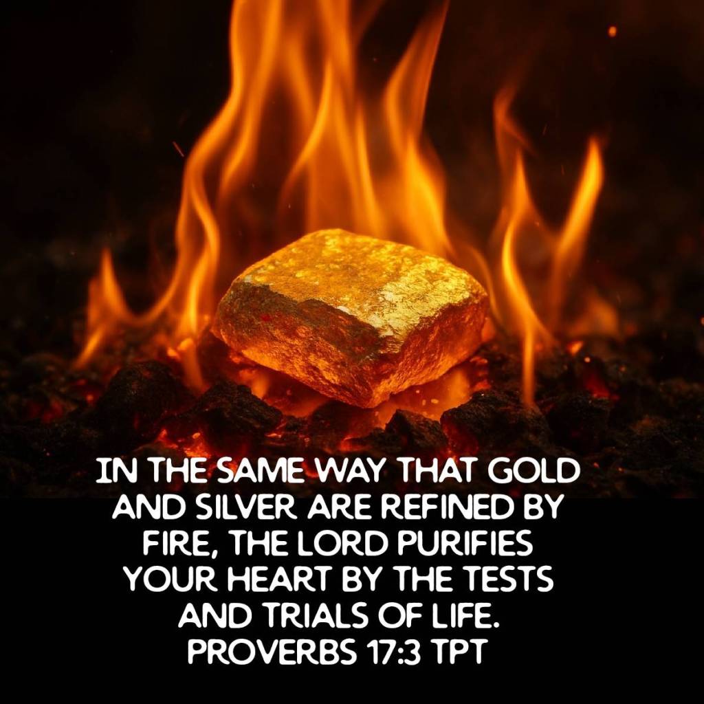 [3] âIn the same way that gold and silver are refined by fire, the Lord purifies your heart by the tests and trials of life.â (Proverbs 17:3 TPT)