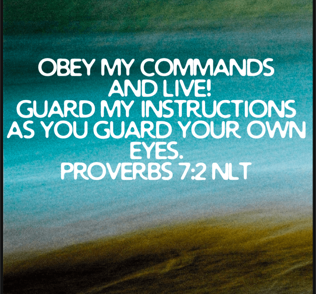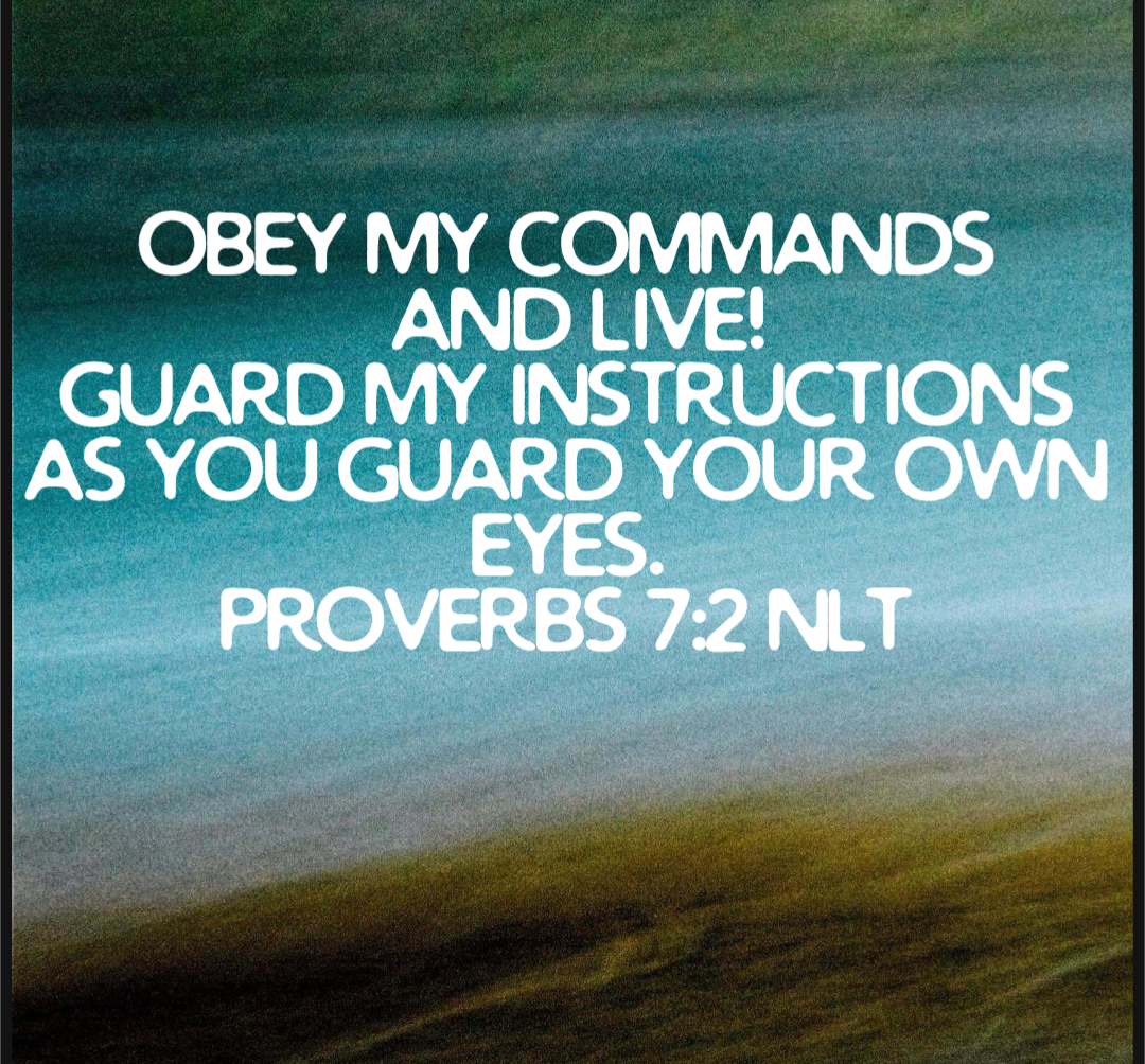 1Follow my advice, my son; always treasure my commands. 2Obey my commands and live! Guard my instructions as you guard your own eyes. 3Tie them on your fingers as a reminder. Write them deep within your heart. (Proverbs 7:1-3 NLT)