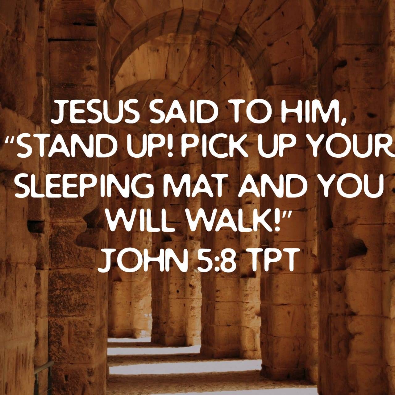 âInside the city, near the Sheep Gate, there is a pool called in Aramaic, The House of Loving Kindness, surrounded by five covered porches. Hundreds of sick people were lying under the covered porchesâthe paralyzed, the blind, and the crippledâall of them waiting for their healing. For an angel of God periodically descended into the pool to stir the waters, and the first one who stepped into the pool after the waters swirled would instantly be healed. Among the many sick people lying there was a man who had been disabled for thirty-eight years. When Jesus saw him lying there, he knew that the man had been crippled for a long time. Jesus said to him, âDo you truly long to be well?â The sick man answered, âSir, thereâs no way I can get healed, for I have no one to lower me into the water when the angel comes. As soon as I try to crawl to the edge of the pool, someone else jumps in ahead of me.â Jesus said to him, âStand up! Pick up your sleeping mat and you will walk!â Immediately he stood upâhe was healed! So he rolled up his mat and walked again! Now Jesus worked this miracle on the Sabbath. When the Jewish leaders saw the man walking along carrying his sleeping mat, they objected and said, âWhat are you doing carrying that? Donât you know itâs the Sabbath? Itâs not lawful for you to carry things on the Sabbath!â He answered them, âThe man who healed me told me to pick it up and walk.ââ â John 5:2â11 (TPT)