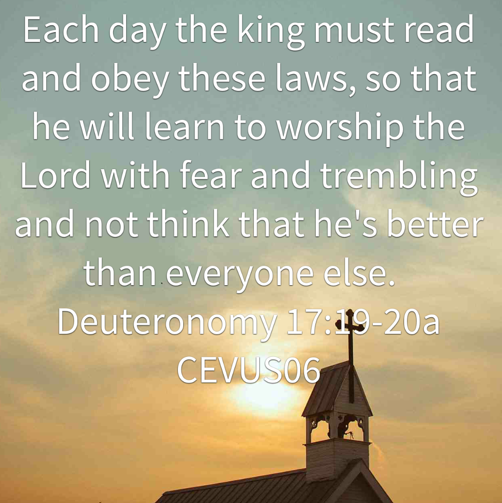 “Each day the king must read and obey these laws, so that he will learn to worship the Lord with fear and trembling and not think that he’s better than everyone else. If the king completely obeys the Lord’s commands, he and his descendants will rule Israel for many years”. (Deut 17:19β-β¬20 CEVUS06)