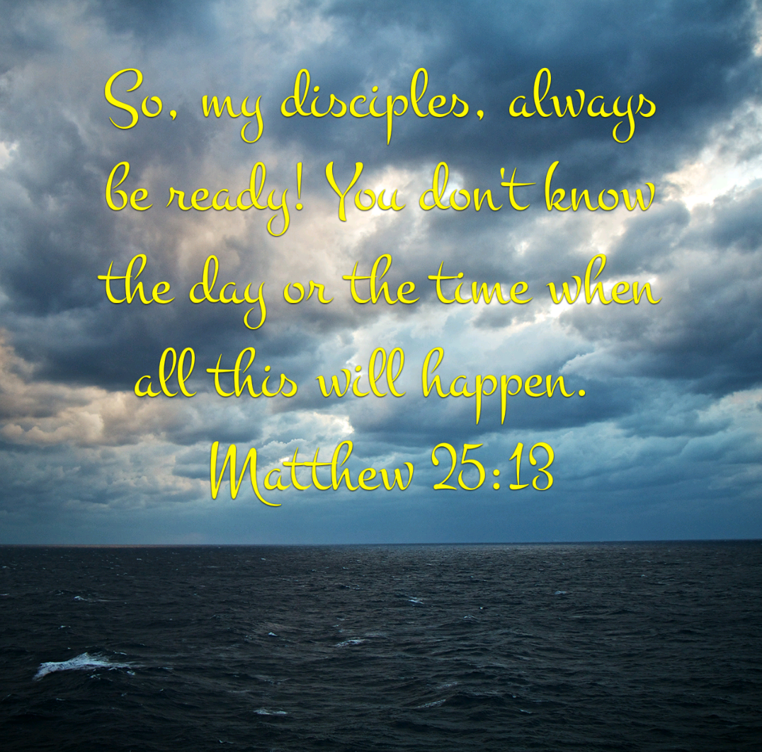 Dear Lord we thank you for today and your Word. We pray we will be found doing the right thing at the right time and won’t miss out on Jesus’ return. And when the time comes, may we hear you say welcome home faithful servant. In Jesus Name we prayed. Amen.