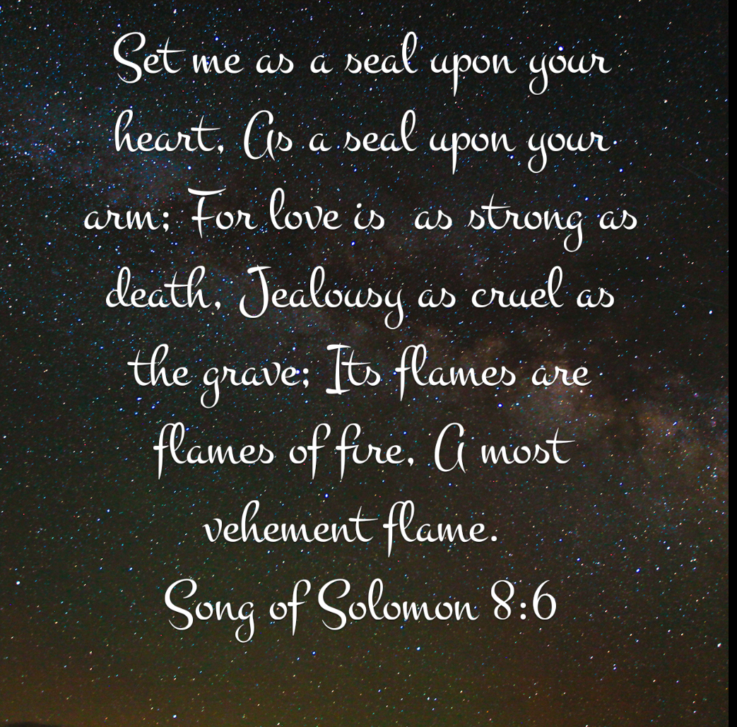 A seal confirms a deed is original and authentic. It’s a stamp of ownership and authenticity on something. She’s asking her lover to claim her completely as his own; to put his stamp of ownership on her heart so she can be completely his and his only. In the same way Jesus has put His seal on us. He has claimed us as his own completely and He is jealous for us.