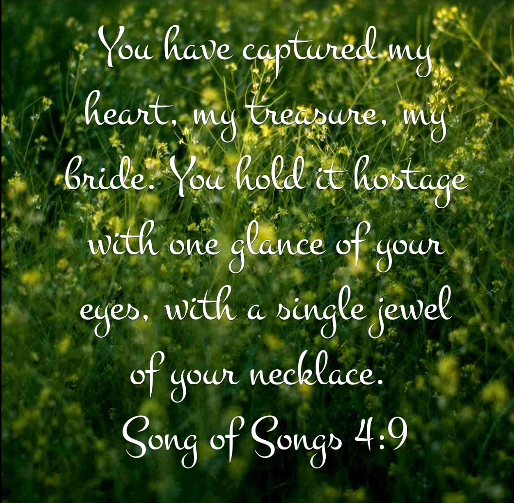 “You have captured my heart, my treasure, my bride. You hold it hostage with one glance of your eyes, with a single jewel of your necklace”. (Song of Songs 4:9 NLT)