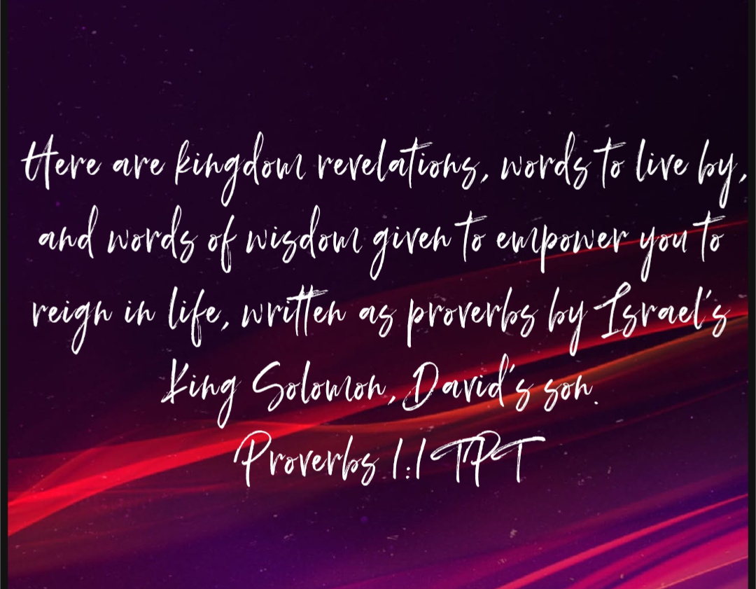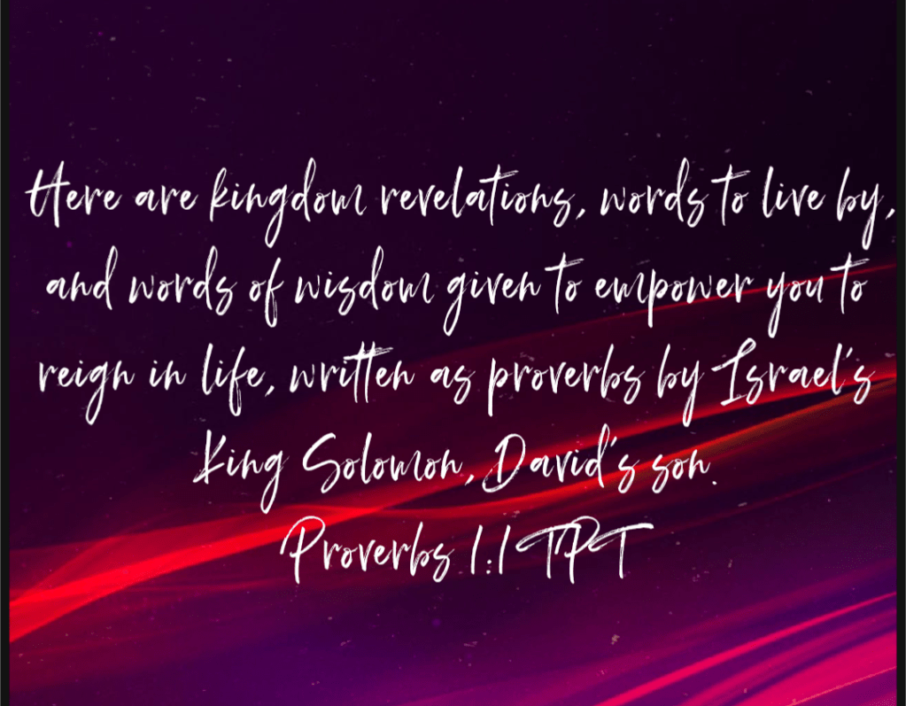 The very first verse caught my attention. It says: “Here are kingdom revelations, words to live by, and words of wisdom given to empower you to reign in life, written as proverbs by Israel’s King Solomon, David’s son”.(Proverbs 1:1 TPT)