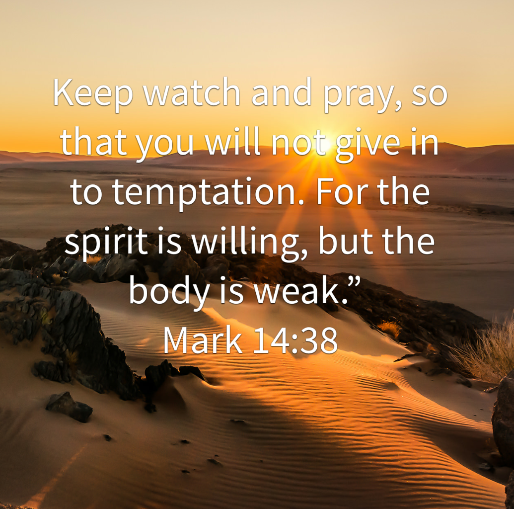 “Keep watch and pray, so that you will not give in to temptation. For the spirit is willing, but the body is weak.”(Mark 14:38 NLT)