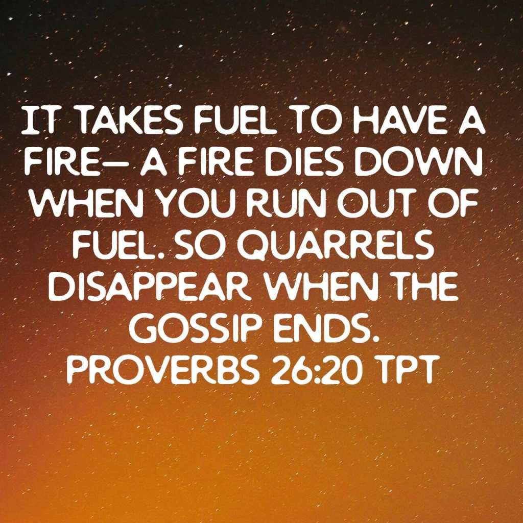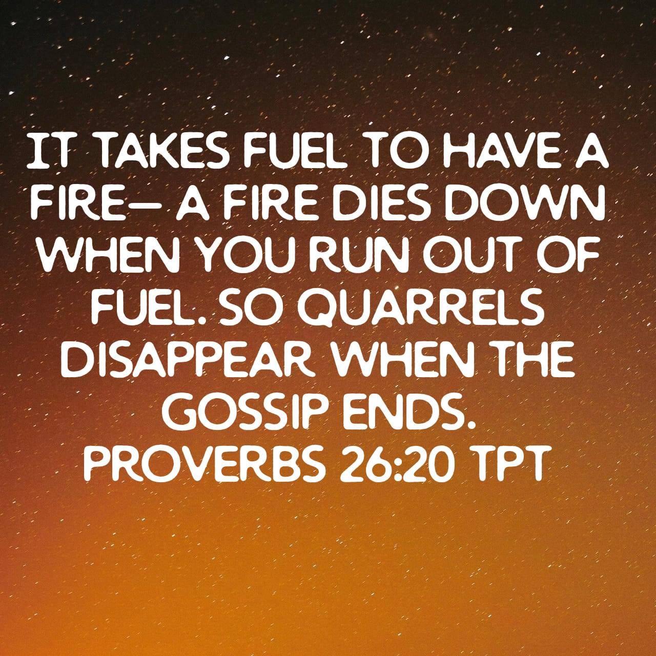 âIt takes fuel to have a fireâ a fire dies down when you run out of fuel. So quarrels disappear when the gossip ends. Add fuel to the fire and the blaze goes on. So add an argumentative man to the mix, and youâll keep strife alive. Gossip is so delicious, and how we love to swallow it! For slander is easily absorbed into our innermost being.â (Proverbs 26:20â22 TPT)